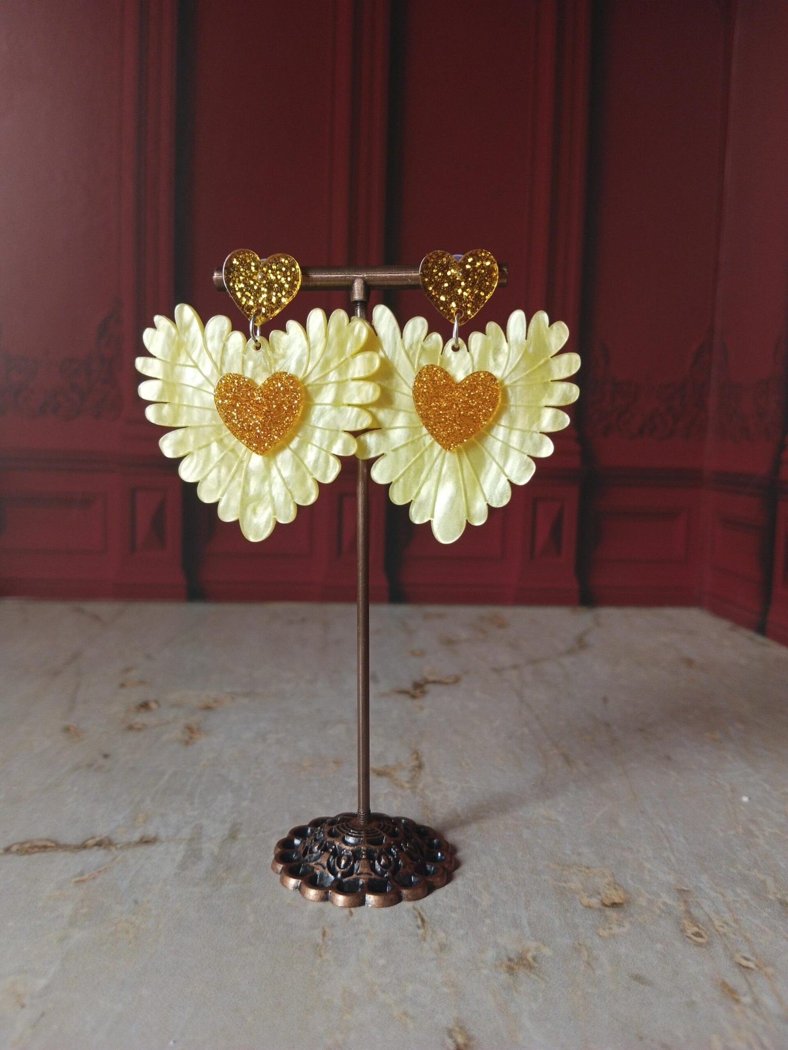 Los Amor Enflorado combinan pétalos en tono lavanda con un corazón central en glitter dorado que roba miradas sin pedir permiso. Su estructura ligera y su movimiento suave hacen que cada paso se sienta encantador, casi como si llevaras pequeñas alas brillando a tu favor.