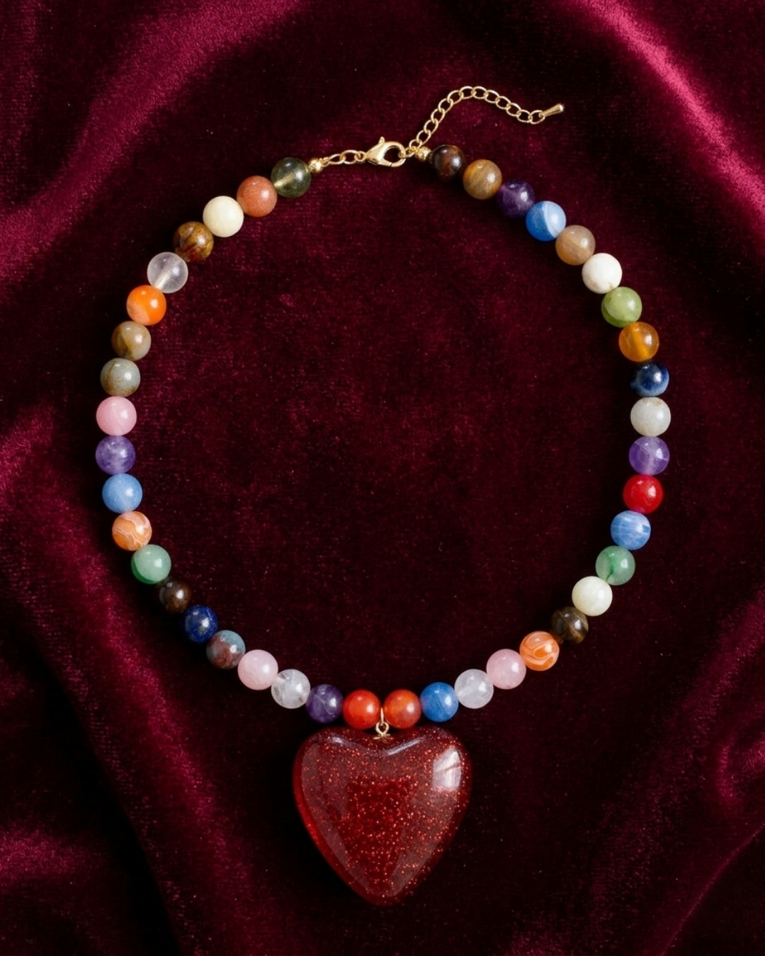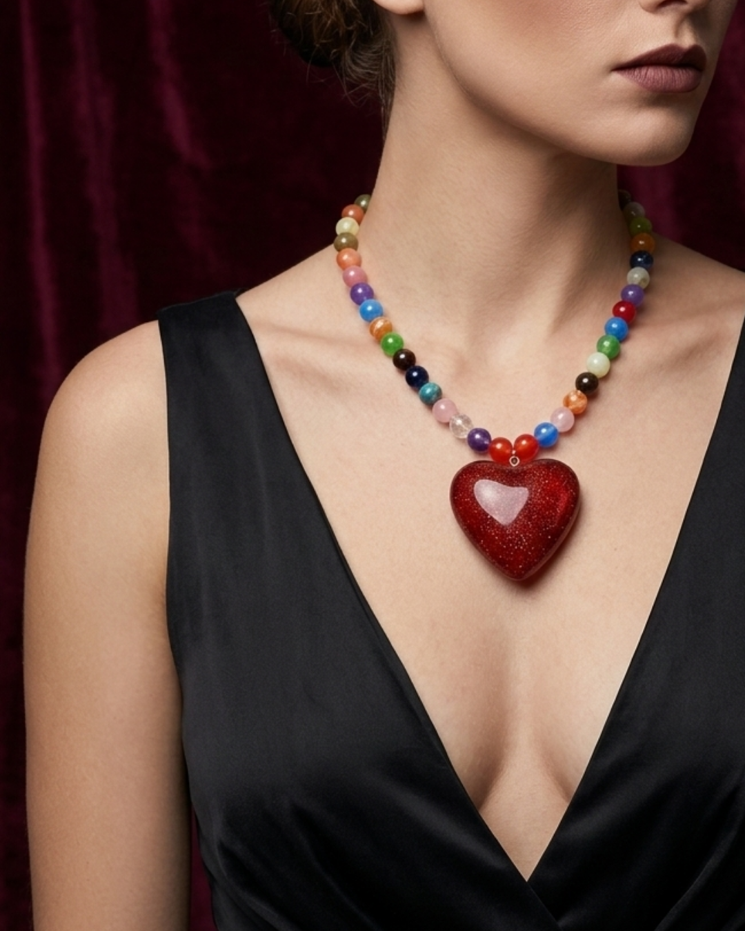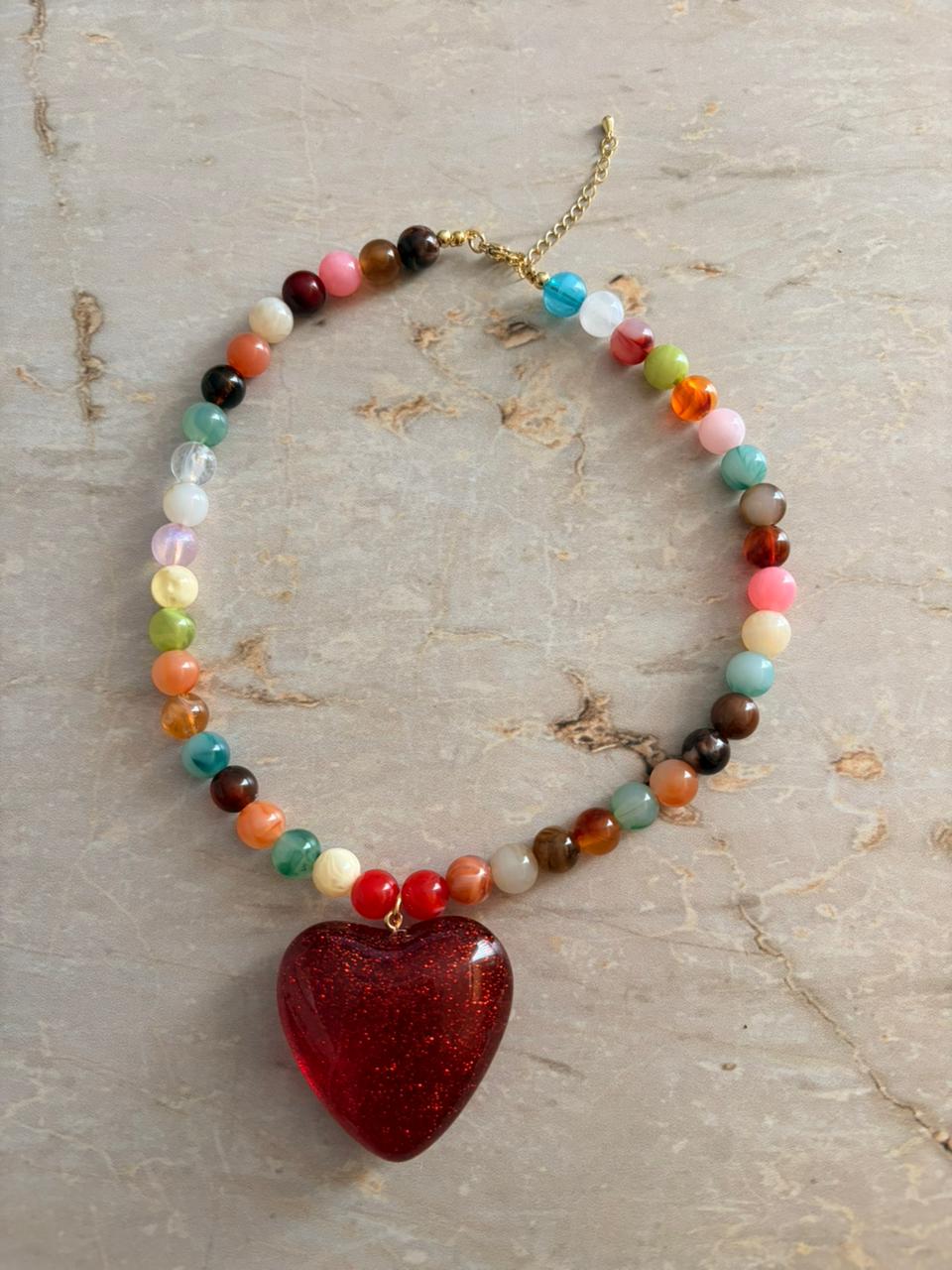 Este collar no es para pasar desapercibida, es para las que aman intenso, viven intenso y se atreven a llevarlo puesto. Su gran corazón rojo brillante roba miradas mientras las cuentas multicolor recuerdan algo muy Cretina: la vida no se vive en neutro.