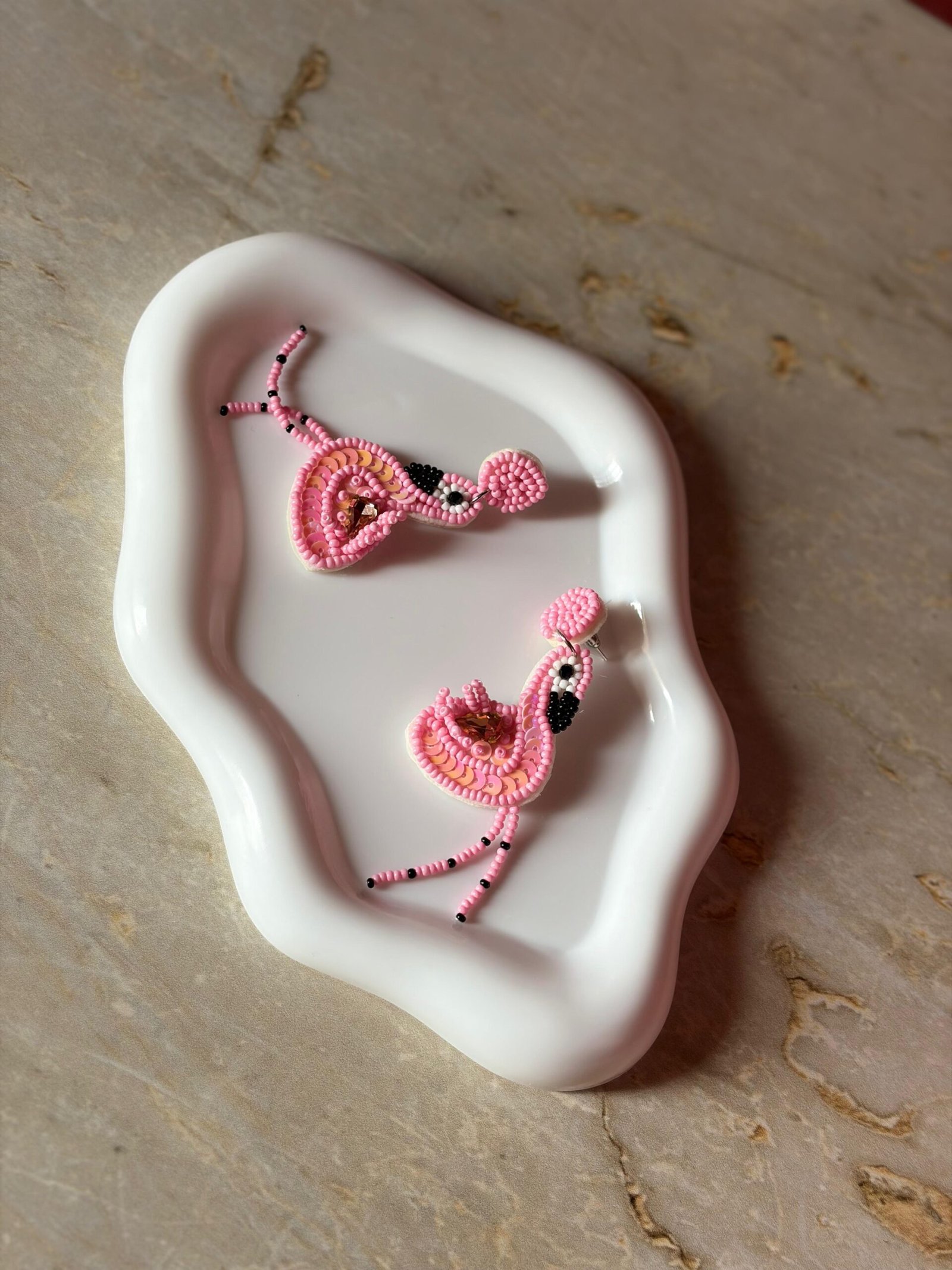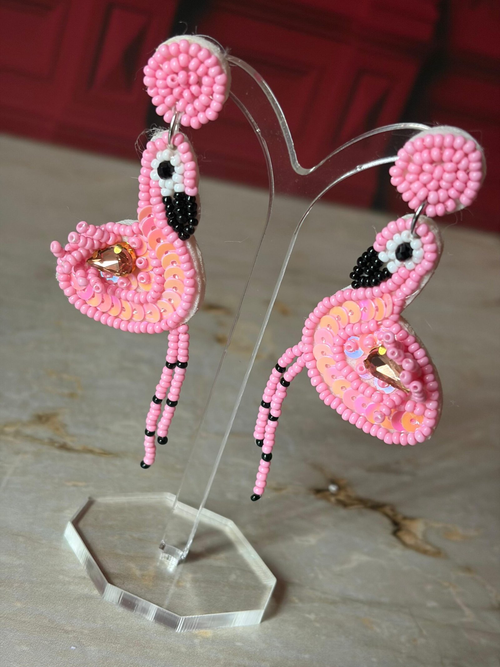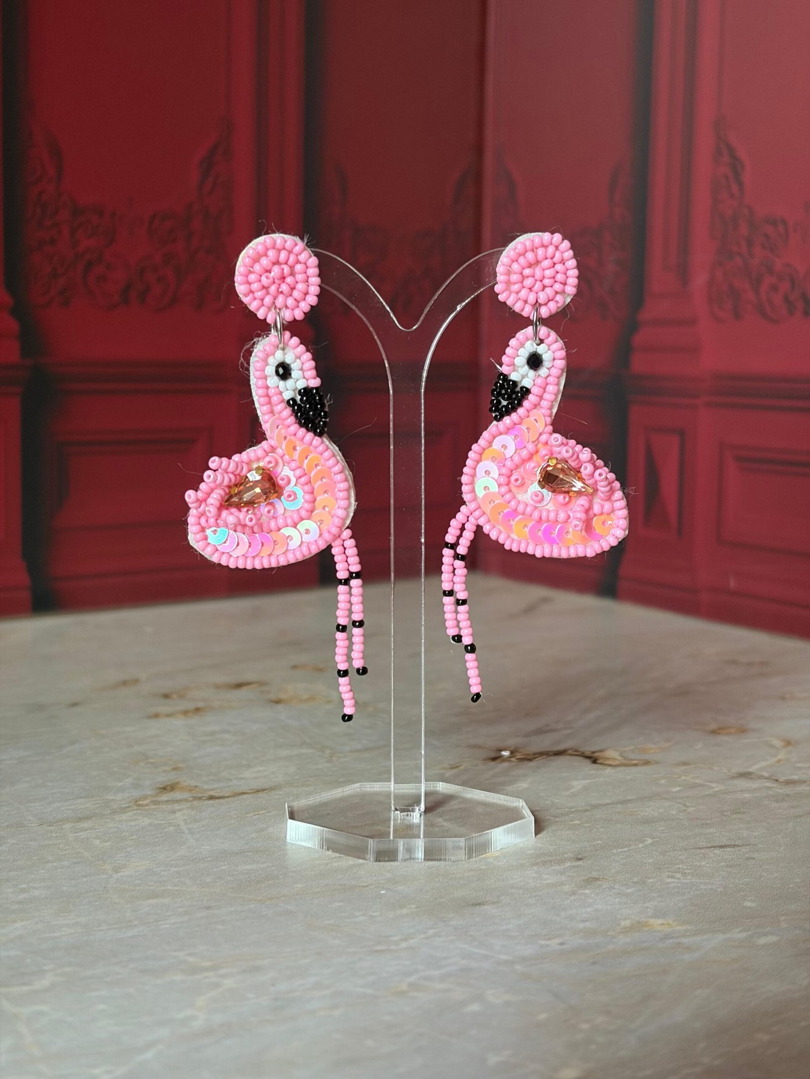 Los Flamenco Coqueta capturan la esencia divertida y elegante de este icónico ave tropical. Elaborados en mostacilla rosa pastel, su forma estilizada y tejido delicado les da un acabado artesanal y encantador. Son ligeros, llamativos y perfectos para quienes aman accesorios con personalidad y un toque de fantasía.