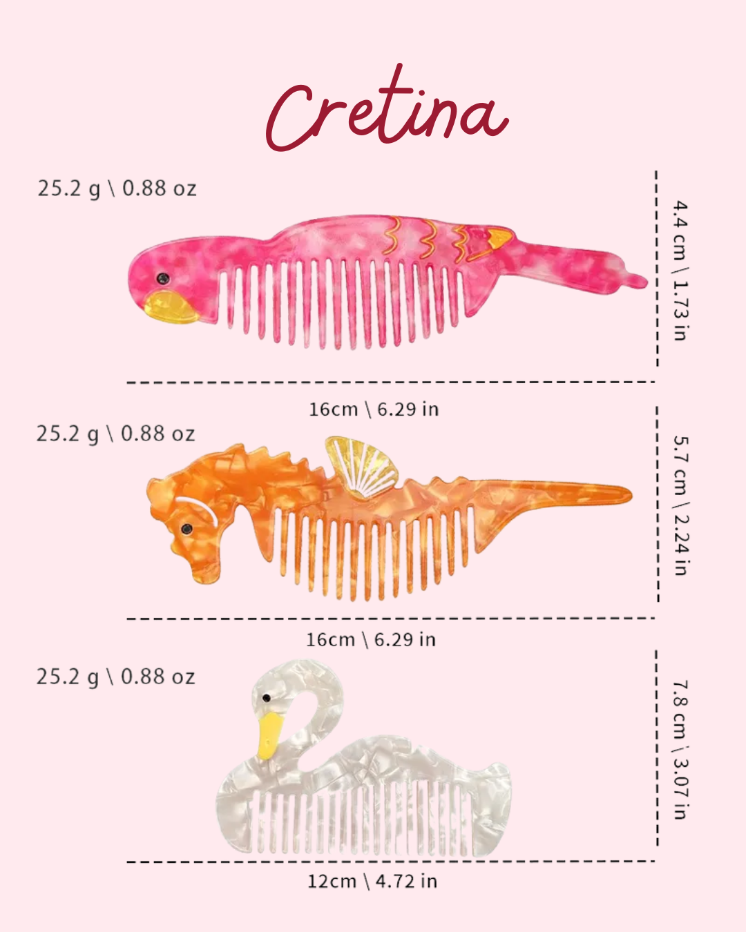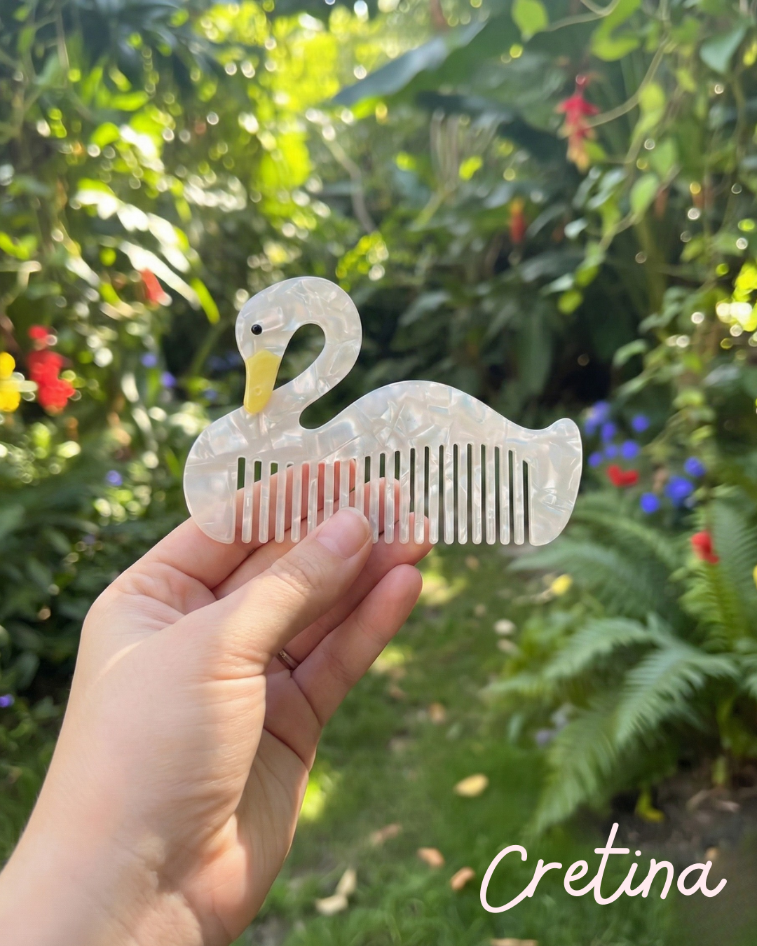 Este peine en forma de cisne es pura elegancia disfrazada de ternura. Su acabado nacarado refleja la luz con sutileza, mientras su silueta estilizada convierte un gesto cotidiano en un pequeño ritual bonito. Ligero, práctico y con ese encanto que no pide permiso, es ideal para llevar en la cartera, usar en casa o simplemente dejar a la vista porque sí. Peinarse nunca fue tan innecesariamente lindo.
