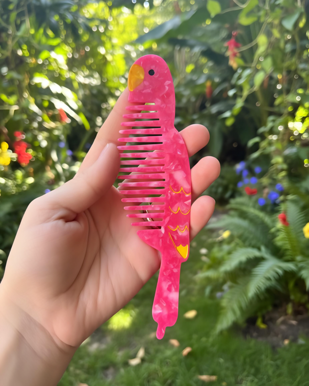 Este peine en forma de ave rosada no vino a pasar desapercibido. Ligero, funcional y absurdamente lindo, es ese accesorio que convierte lo cotidiano en un gesto coqueto. Su diseño animal y acabado tipo acetato le dan un aire juguetón, mientras sus dientes firmes desenredan el cabello con suavidad. Perfecto para llevar en la cartera, tener en el tocador o simplemente usarlo porque sí… porque peinarse también puede ser divertido.