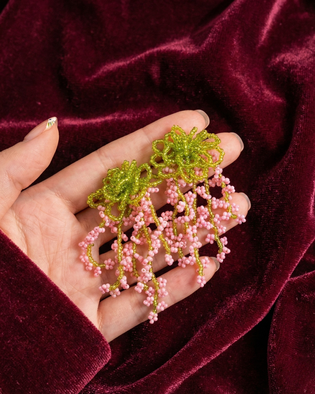 Cuando la naturaleza se pone coqueta, nacen las Ramitas de Primavera. Aretes de cuentas que caen en forma de ramitas danzantes, ligeros pero llenos de presencia. Se mueven contigo, brillan con la luz y traen ese aire fresco de los días que florecen.