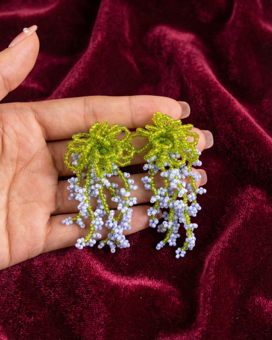 Cuando la naturaleza se pone coqueta, nacen las Ramitas de Primavera. Aretes de cuentas que caen en forma de ramitas danzantes, ligeros pero llenos de presencia. Se mueven contigo, brillan con la luz y traen ese aire fresco de los días que florecen.