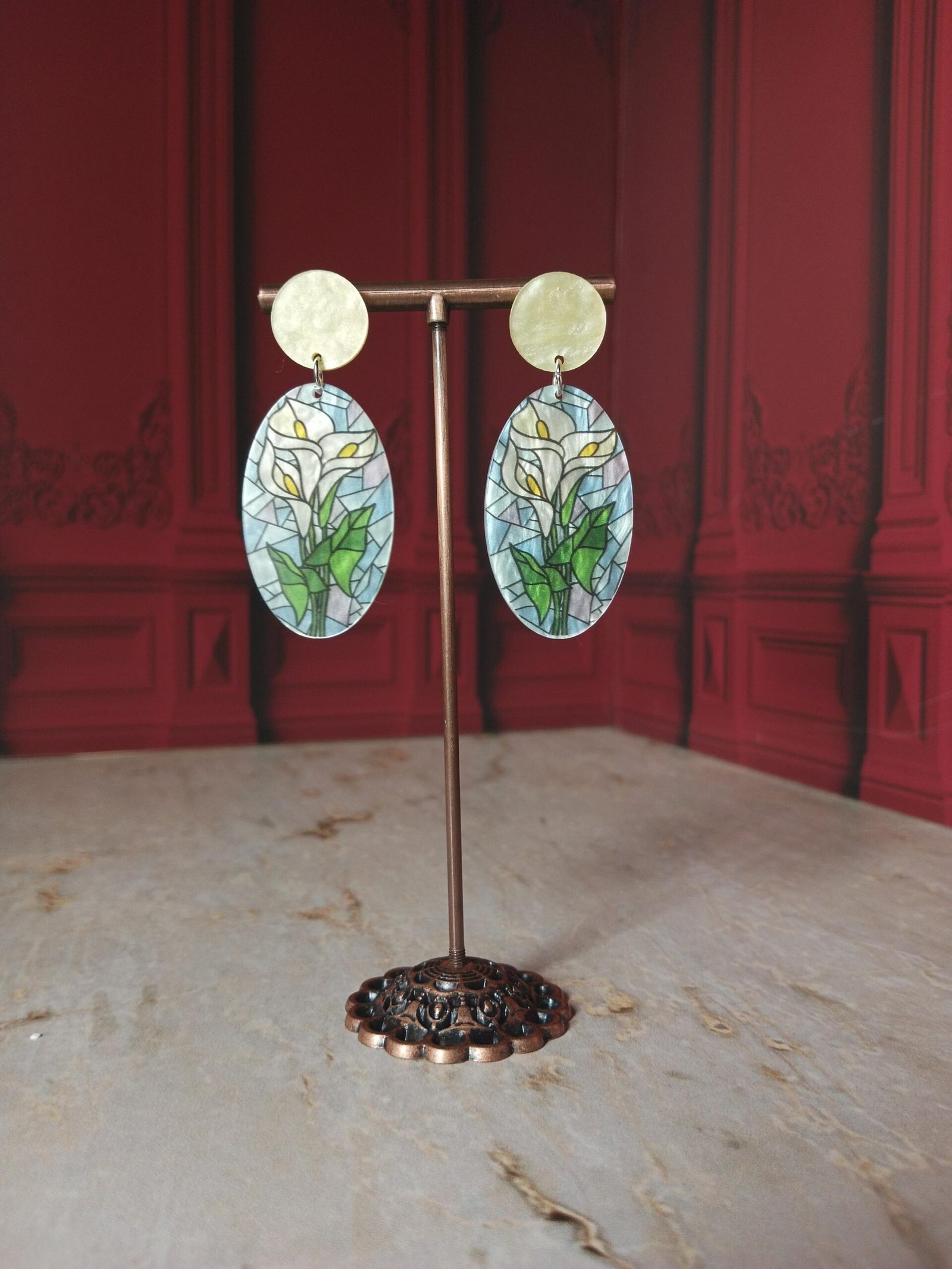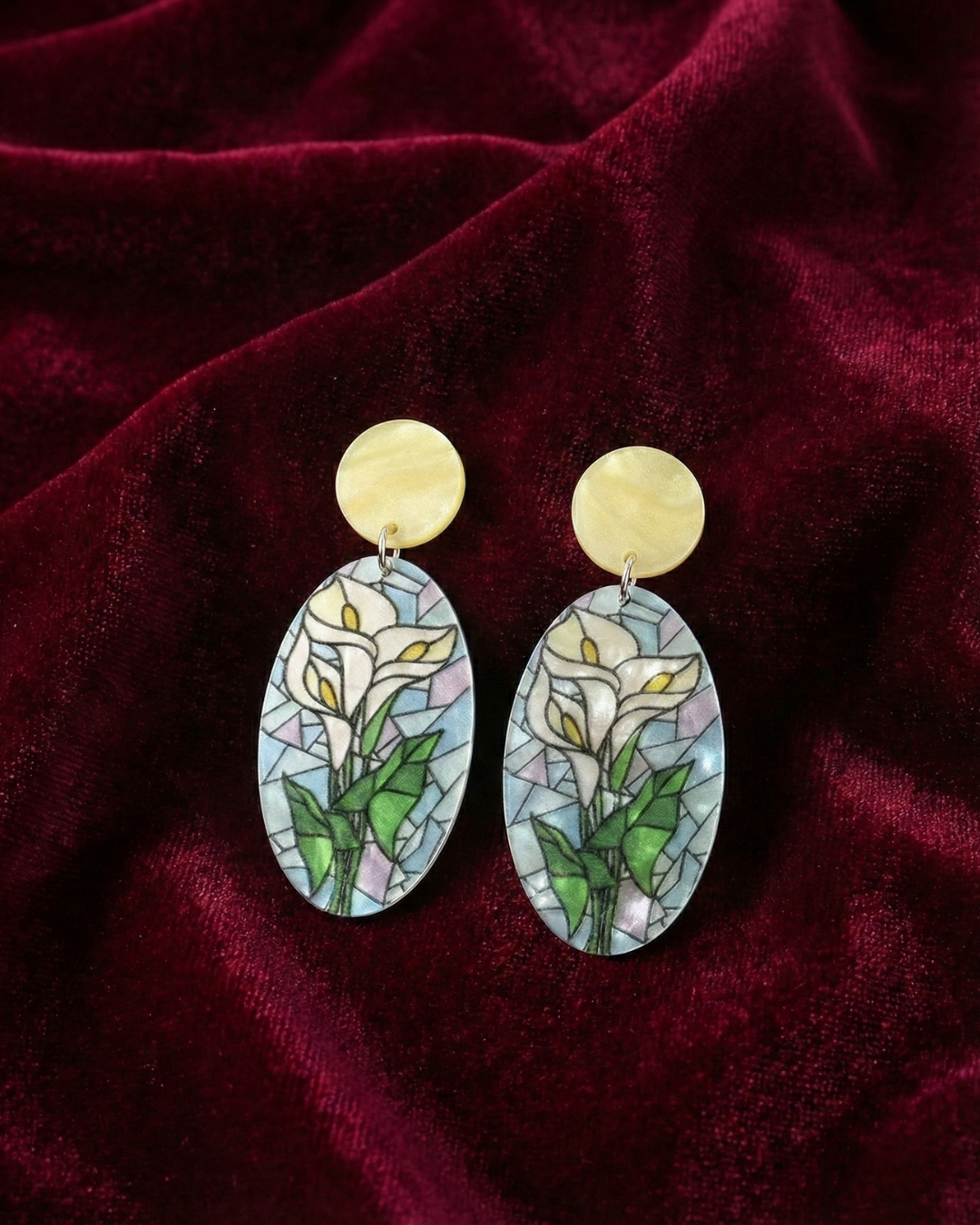Los Vitrales Florales son aretes diseñados para quienes aman llevar arte en cada detalle. Inspirados en las ventanas de vidrio tinturado, combinan colores vibrantes con figuras botánicas que parecen pintadas a mano. Su acabado translúcido crea un efecto delicado y luminoso que se ve precioso con la luz natural.